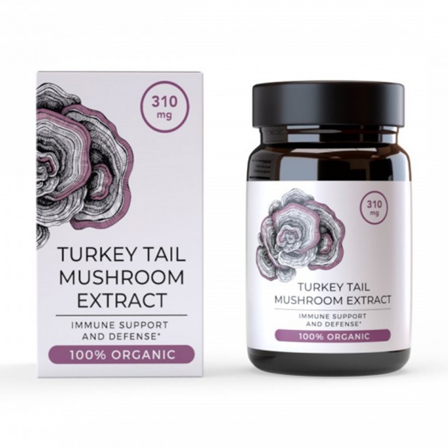 Υπερσυμπυκνωμένο εκχύλισμα Turkey Tail σε φυτικές κάψουλες. Κάθε δόση 310mg ισοδυναμεί με 9300mg σκόνης μανιταριού για ανοσοποιητική και πεπτική υποστήριξη.